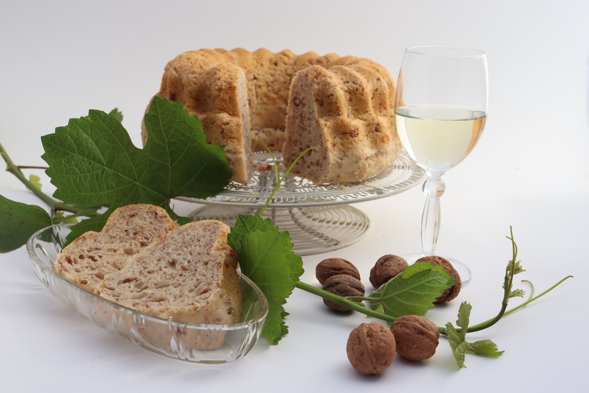 Es war eine schöne Eröffnung der Vinothek im Rheinhessen.Shop. Für die gute Laune sorgte auch, natürlich neben den tollen Weinen vom Junghof in Undenheim, mein Rieslingbund. Wer das Kochbuch "Wein im Topf" schon besitzt, kann das folgende Rezept auf Seite 59 finden, für alle anderen schreibe ich es heute in diesen Blog. Der Rieslingbund ist nicht nur ein toller Weinbegleiter, sondern auch ein Tipp für ein schönes Picknick im Grünen - herzhaft und lecker. Allerdings braucht es etwas Vorbereitungszeit, d.h. wir haben es mit einem Hefeteig zu tun, der ja bekanntlich Zeit braucht, um sein volles Können zu entfalten. Vom Hefewürfel bis zum fertigen Kuchen, soltet ihr schon drei Stunden Zeit einrechnen, wovon sehr viel Reifezeit ist, man also nebenher noch andere Sachen machen kann. Es gibt für diesen Bundkuchen eine Alternative für Vegetarier (siehe unten im Rezept). Die Zutaten: 30 g Frischhefe, 1 Prise Zucker, 4 El Milch (lauwarm), 500 g Mehl, 2 Eier, 1 Tl Salz, 200 ml Riesling, 150 g zimmerwarme Butter, 150 g Schinkenspeck (mildgeräuchert und mager, in feine Würfel geschnitten), 100 g Emmentaler Käse (gerieben), 100 g Walnüsse (grob gehackt) und etwas Butter zum Einfetten der Form. Die Kuchenform kann aus Metall, Silikon oder, so mache ich das gerne, eine aus Keramik sein. Wer jetzt nichts mit Bundform anfangen kann: es ist eine Gugelhupf Backform. In Rheinhessen spricht man vom Bund, Bundkuche. Es geht los mit dem Vorteig. In einer kleinen Schüssel die Hefe und den Zucker (den brauchen die Hefebakterien zum Loslegen) in der Milch (lauwarm) auflösen und ca. 15 Min gehen lassen, zimmerwarm oder im 30°C warmen Backofen, ohne Zugluft. An warmen Tagen stelle ich die Schüssel abgedeckt in die Sonne, das spart Energie. Wenn die Hefebakterien so richtig losgelegt haben (Vorteig sollte Bläschen machen), eine Rührschüssel nehmen und das Mehl hineinschütten. In die Mitte mit einem Löffel eine Mulde machen und dahinein die Eier, den Hefeansatz und das Salz geben. Nun langsam die Zutaten vermischen und nach und nach den Wein zugeben. Der sollte natürlich auch zimmerwarm sein. Es entsteht ein fester Teig. Diesen gründlich kneten und klopfen, um ihn zu durchlüften. Man darf natürlich auch eine Küchenmaschine verwenden. Nach und nach die Butter einarbeiten. Den Teig dann in der Schüssel mit einem Tuch bedeckt, wieder zimmerwarm 45 bis 60 Min gehen lassen. Ist der Teig gut aufgegangen, fügt man den fein gewürfelten Schinkenspeck, den geriebenen Käse und die grob gehackten Walnüsse dazu und arbeitet diese in den Teig ein. Für Vegetarier: den Schinkenspeck kann man super mit 100 g in Öl eingelegten getrockneten Tomaten ersetzen, die man dazu in feine Würfelchen schneidet, damit sie sich gut im Teig verteilen. Den Teig in die gut gefettete Bundform füllen und nochmals 45 bis 60 Min gehen lassen, er sollte sich verdoppeln! Im vorgeheizten Backofen bei 190°c ca. 45 Min backen, bis der Kuchen goldbraun ist. Mit der Stäbchenprobe könnt ihr feststellen, ob er durch ist. Ich lasse den Kuchen in der Form erstmal etwas abkühlen und stürze ihn dann auf ein Kuchengitter zum Auskühlen. Man kann den Kuchen in Scheiben servieren, oder in kleine Stücke schneiden (zum Wein). In einer Brotbox (Lunchbox) bleibt er schön frisch, wenn ihr ihn zum Picknick mitnehmen wollt. Der Rieslingbund ist jedesmal ein Highlight, wenn wir abends ein paar Gäste zum Gläschen Wein empfangen und auch unterwegs immer ein Gaumenschmauß! Wenn ihr den Kuchen backt, werdet ihr feststellen, wie gut der Wein dem Teig tut, denn der wird so schön samtig und dann wird er besonders locker (und lecker). Dann wünsche ich viel Spaß beim Nachbacken und Geniessen, die Selztalerin!