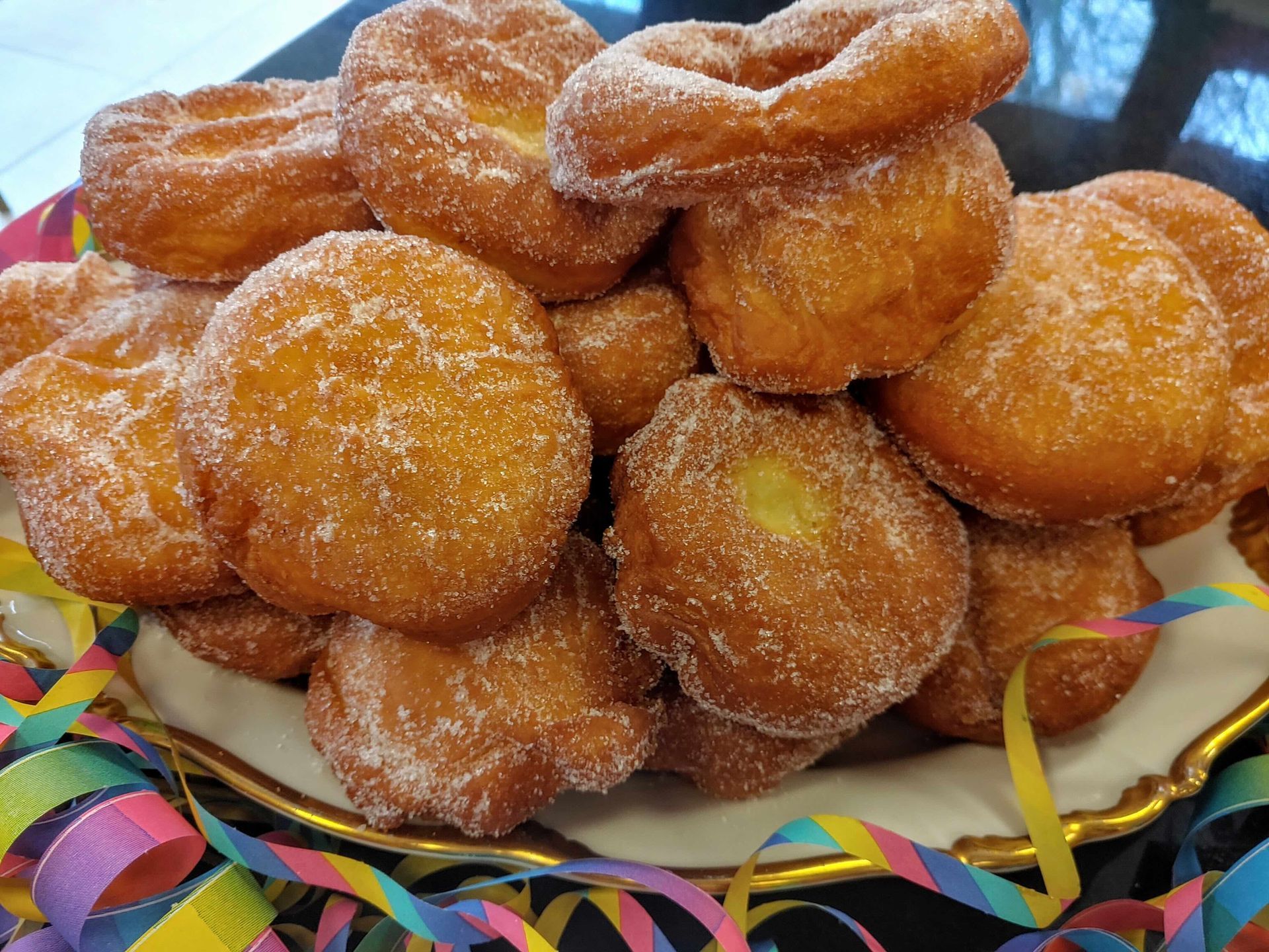 Sinn se net goldisch? Ich war an der Bäckertheke und hatte so Lust auf Krebbel. Die Preise sind auch hier ganz schön zum Abgewöhnen. Sicher ist das alles gerechtfertigt, aber: wenn ihr gleich meine Zutatenliste lest, dann ist selbst backen eine echt preiswerte Alternative. Es kommt eine schöne Menge zusammen, die einfach einlädt zu teilen. Die Krebbel sind ein tolles Mitbringsel, frisch zubereitet ein echter Genuss und sie machen Menschen glücklich. Mit am besten selbstgemachter Marmelade gefüllt: kaum zu toppen! Und das nicht nur, weil Fassenacht ist. Das Rezept: Man nehme 500 g Mehl, 250 ml lauwarme Milch, 20 g Frischhefe (ca. halber Hefewürfel!), 50 g Zucker. Daraus macht ihr einen Vorteig (gerne mit der Küchenmaschine). Den lasst ihr mind. 20 Min ruhen, abgedeckt an einem warmen, zugluftfreien Ort, den hab ich am Holzofen oder bei 30°C im Backofen. Dann gehts weiter mit 75g weicher Butter, 2 Eier (M), 3 g Salz und 1 El Gin, geht auch Obstler oder nix. Alkohol fördert nochmal die Fluffigkeit der Krebbelchen. Meine Oma hat sogar noch eine Prise Muskatblüte dazu gemacht. Die restlichen Zutaten mit dem Vorteig in der Küchenmaschine ca. 15 Min verkneten, bis ein samtiger Teig entstanden ist. Der Teig muss nun wieder eine gute Stunde ruhen, abgedeckt, warm. Jetzt den Teig nochmal von Hand etwas kneten und mit dem Weljerholz (Nudelholz) ca. 1 cm dick ausrollen. Mit einem Glas (vor dem Stechen in etwas Mehl getaucht) ausstechen. Die Teiglinge auf ein Blech mit bemehltem Backpapier setzen und nochmal eine Stunde gehen lassen, mit Tuch abdecken. Die Zeiten sind echt besonders wichtig, damit der Teig Zeit zum Reifen hat und damit auch dessen Bekömmlichkeit (gegen Sodbrennen) gefördert wird. Habt ihr eine Fritteuse, dann auf 170°C einstellen, im Topf mit Frittiereinsatz empfehle ich ein Thermometer mit hinzuzuziehen. Wenn das Fett heißer als 170°C ist, werden die Krebbel außen Braun und innen babbisch, außerdem entstehen Transfettsäuren, die gesundheitsgefährdend sind. Klassisch gilt der Krebbel als Schmalzgebäck, also in Wutzeschmalz gebacken. Davon hatte man früher viel, schon wegen der Hausschlachtungen. Heute bedient man sich Frittierfetten oder, was ich benutze: Sonnenblumen oder Färberdistelöl. Die schön aufgegangenen Teiglinge in des erhitzte Fett geben und von beiden Seiten ca. 2 bis 3 Min. frittieren. Hängt natürlich von der Größe ab. Am besten macht ihr einen Probekrebbel und stoppt die Zeit. Dann kann man den Rest durch frittieren. Der gebackene Krebbel kommt dann in Kristallzucker, manche mögen Puderzucker, den aber erst auf den kalten Krebbel. Wenn ihr jetzt noch eine Füllung wollt, dann stecht auf einer Seite mit einer Tortenspritze, die ihr natürlich vorher mit eurer Lieblingsmarmelade gefüllt habt, in den Krebbel und drückt eine kleine Portion hinein. Kleiner Tipp: wenn man die Krebbel zu einer Gesellschaft mitnimmt, dann wird in Rhoihesse auch gern einer mit Senf gefüllt! Gude un H e l a u !